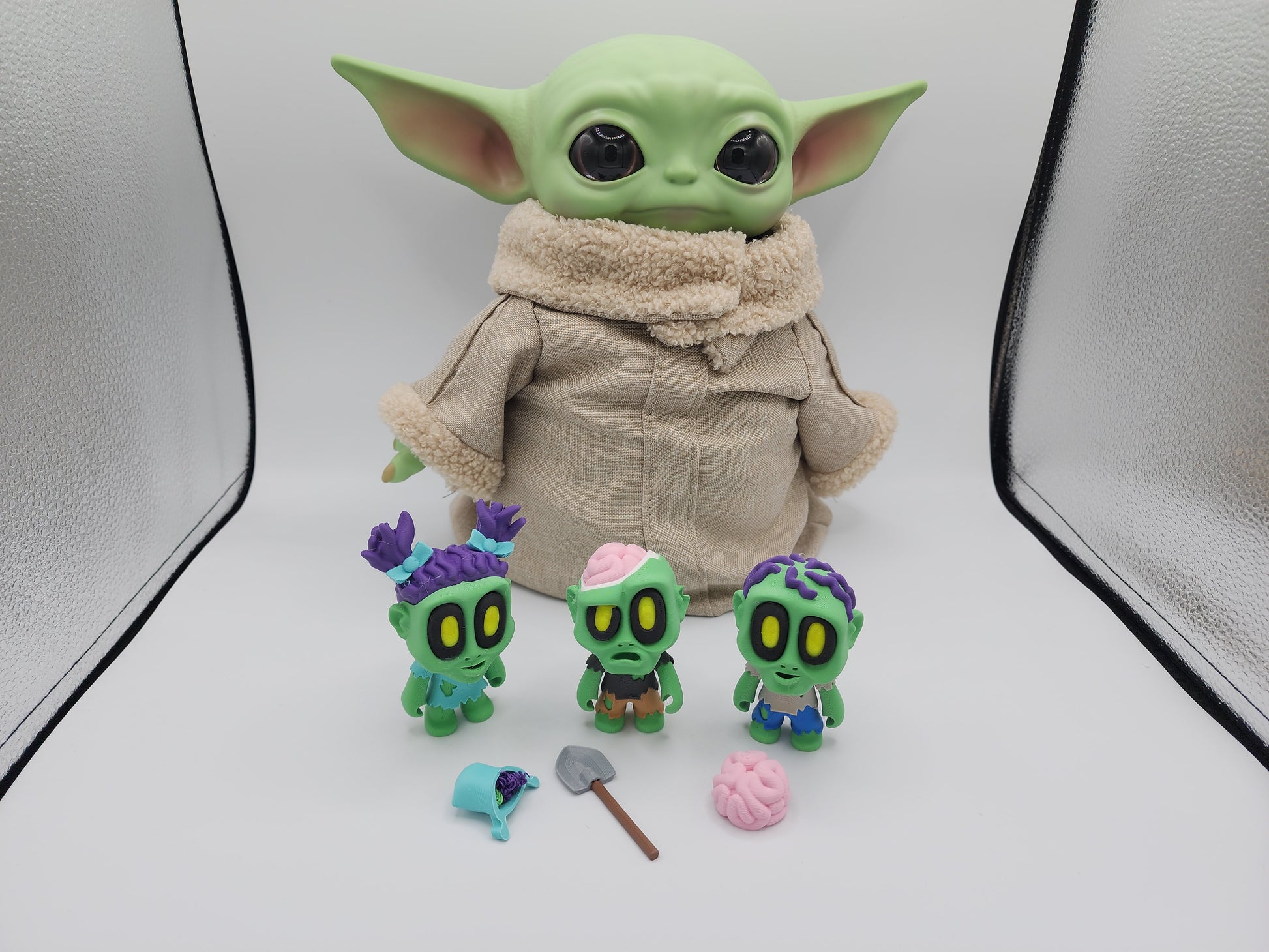 Its Spooky Season and what better way to celebrate than with Zombies.  These sets of Blob Zombies are just adorable, especially with their Yellow Glowing Eyes.  Now is your chance to own these limited edition set of the Blob Zombies.  Each set has one of each Zombie heads (2 Boy, 1 Girl) on the appropriate Body.  Each set comes with its accompanying set of items; a Candy Bag with Candy, a Shovel, and a Brain they can hold on too.  Individual Zombies come with one item of your choice, which we will discuss at time of order.